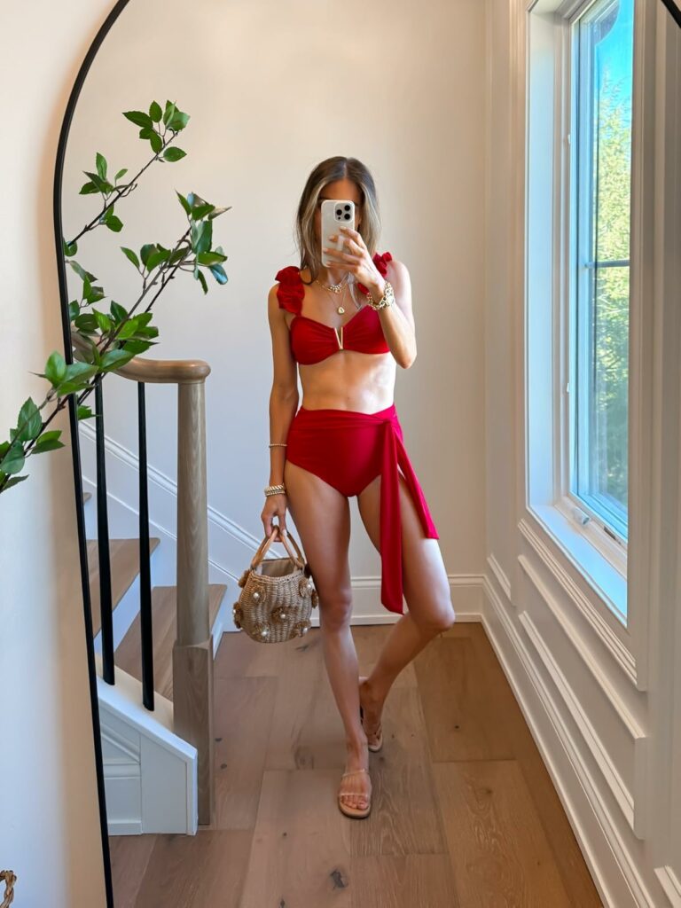 Starting things out with this gorgeous red bikini & crochet pants! They are a boho-chic option that pair beautifully with any swimwear. This is a staple look for any resort.