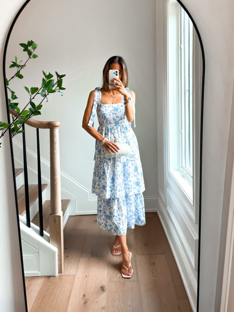 This blue and white floral dress would be a dream for Easter or Mother’s Day.
