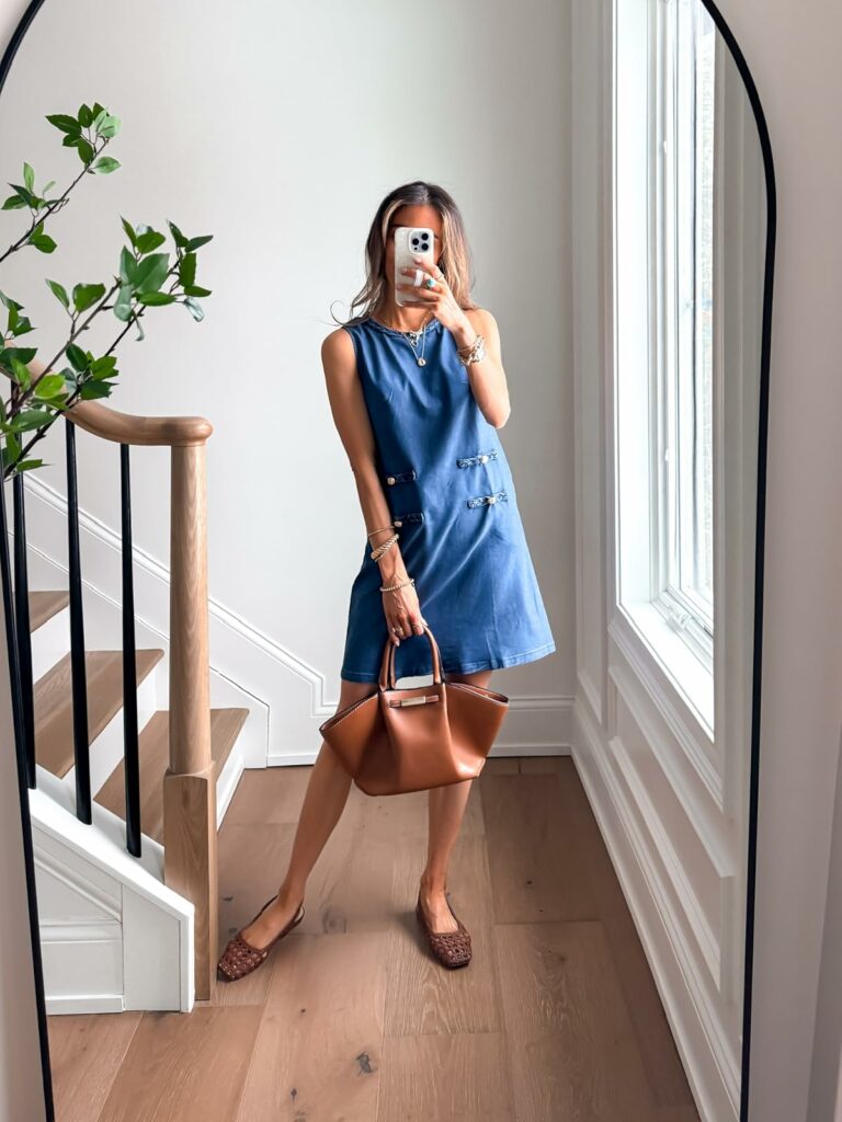 A simple denim dress is an effortless outfit choice for a day of sightseeing or shopping.