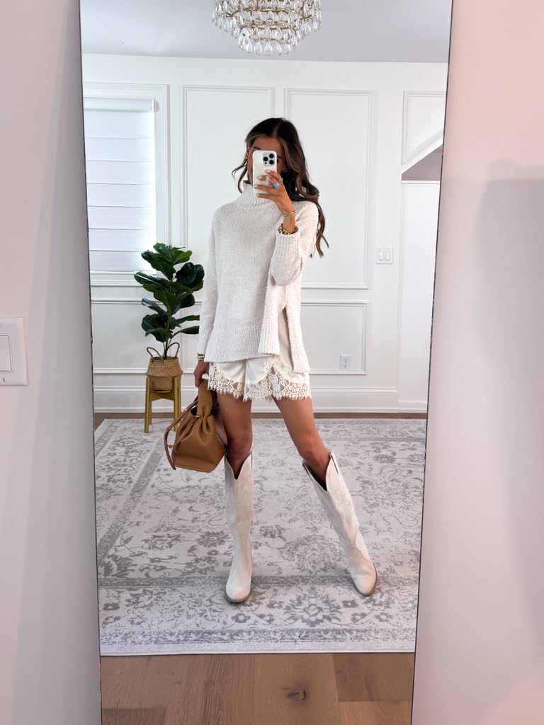Layering sweaters with lace skirts or shorts is one of my favorite style trends! It’s cozy, practical and so cute. To warm up this look throw on my favorite pair of fleece-lined tights.