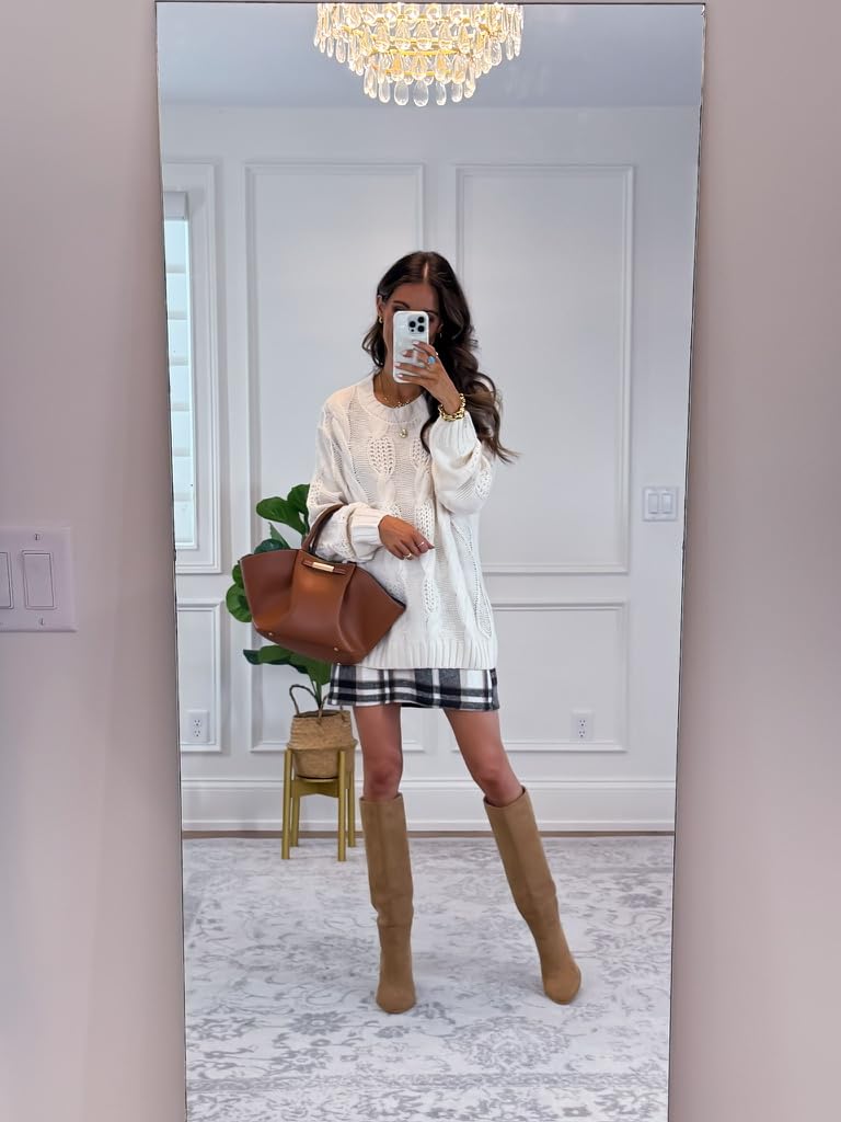 For something a little dressier, try pairing a plaid skirt with a great cable knit sweater. It’s the perfect balance of comfort and style. The sweater is under $30 and comes in several colors!